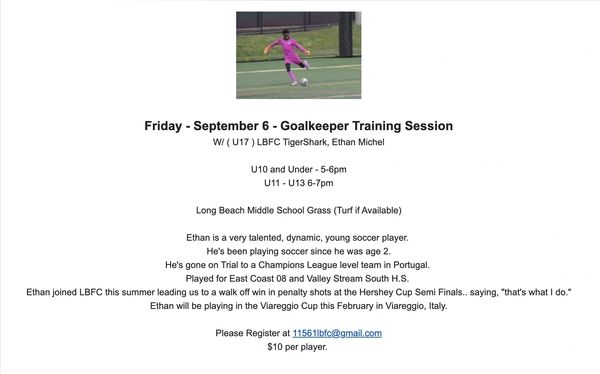 Players have the option to come to both days for a discounted price or can choose 1 day! It is for girls and boys 7-14 at Long Beach High School (9:00am-12:00pm)